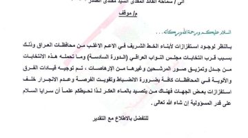 الصدر يطالب سرايا السلام بالتزام الانضباط وتجنب الاستفزازات الانتخابية