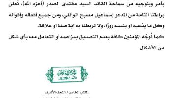 الصدر ينفي صلته بإسماعيل مصبح الوائلي ويبرأ من أقواله وأفعاله