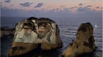 حزب الله يتجاهل قرار الحكومة ويضيء صخرة الروشة بصور نصرالله وصفي الدين