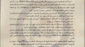 • “هيئة الإعلام والاتصالات تفرض حظراً على ظهور إعلامي عراقي لمدة 120 يوماً”